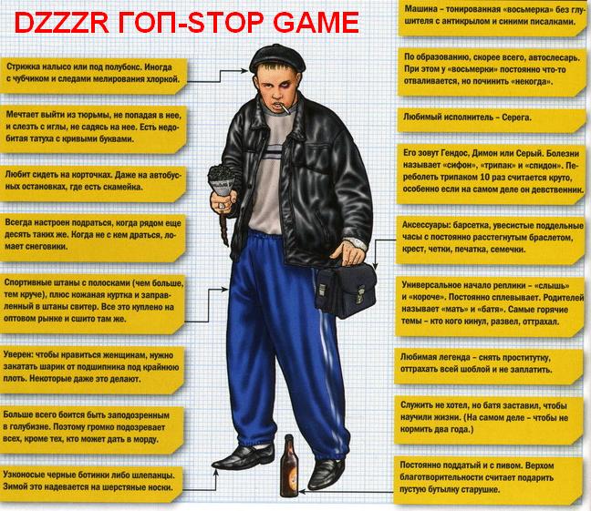- прикид чоткава пацанчика: кэпка, спортивные штаны с лампасами и обязательно строгие ботинки, барсэтка, мобила, сэмки, кожаная куртка или балахон с капюшоном (оригинальная орфография сохранена)