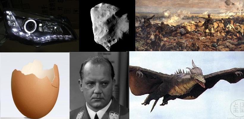 Ну это же ЭЛЕМЕНТарно: яркий свет фары; астероид, названный в честь древнего поселения на месте Парижа; вторая битва при Ипре; полезная яичная скорлупа; знаменитая роль Юрия Визбора; один из самых известных врагов Годзиллы.